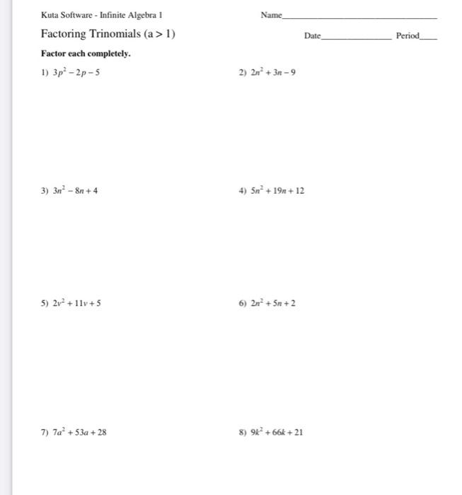 1 p p 2 n n 3 p p 4 r r 5 p p 6 b b. Kuta Software - Infinite Algebra 1 Name_____ Factoring Trinomials a 1 Date_____ Period____ Factor each completely. Pdf worksheets with no login required.