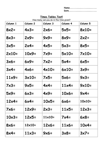 Times Tables Tests 6 7 8 9 11 12 Times Tables